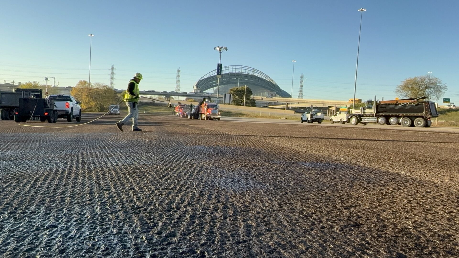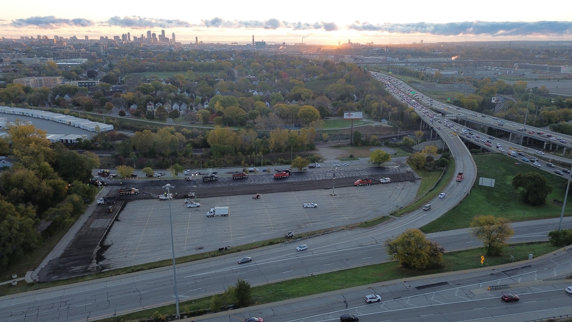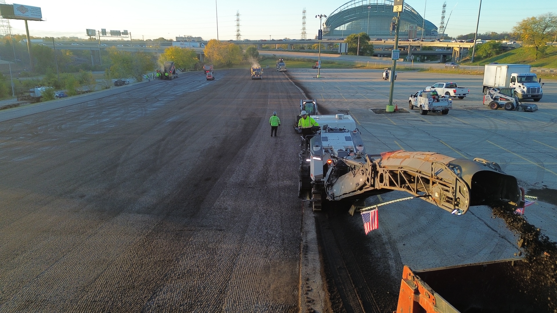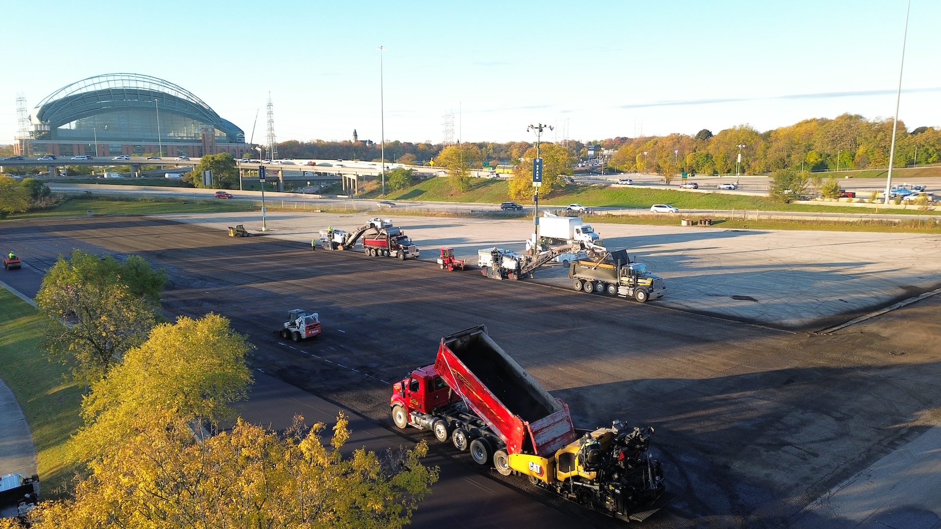 PLM Paving completed a 2-inch mill and asphalt resurfacing project at the Yount Lot at American Family Field, restoring approximately 158,000 square feet of parking surface. The project required careful planning and coordination to complete the milling and repaving in a single day so the lot could quickly return to service for stadium operations and event traffic.